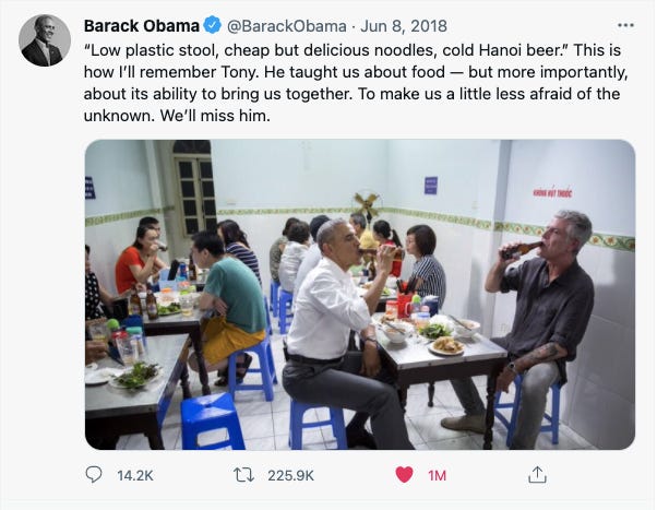 The day Anthony Bourdain died President Obama sent the following tweet: