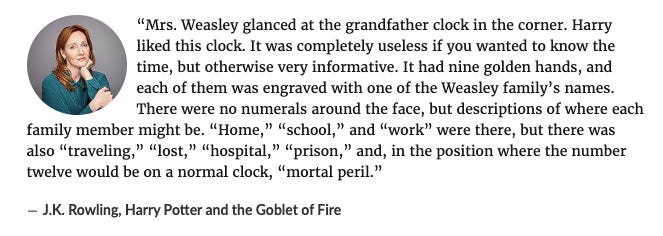 Every parent would want a clock that magically tells you where each of your children is or might be doing. While I can’t have a clock like this, I have the modern equivalent of the “Find My” app on my iPhone. The kids have always teased me about stalking them on my phone, but I use it just as Mrs. Weasley used her family clock–to check in on her family and see their general location1. Sometimes, when I am missing them, I look to see where they are. I feel better when I see them in their homes.