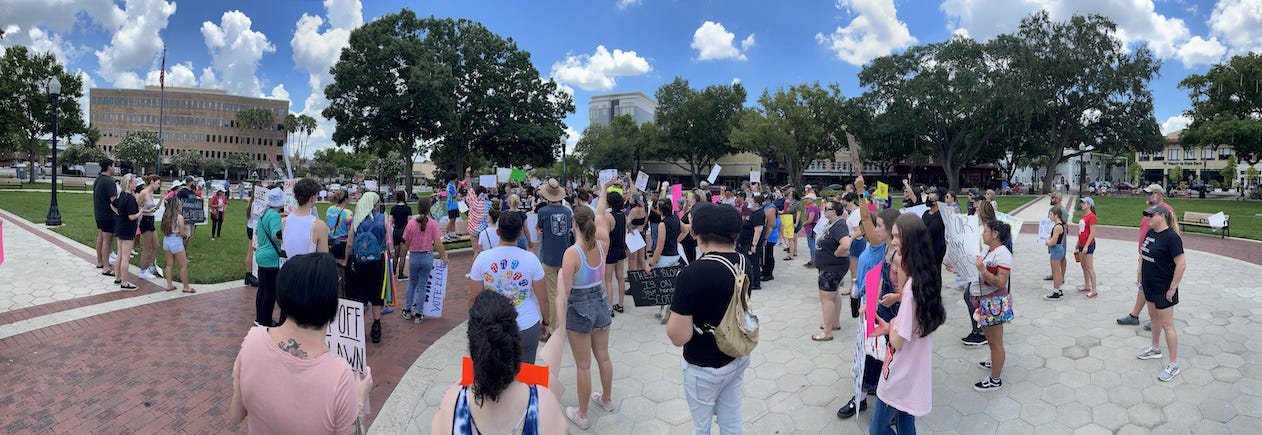 While we were at today’s protest, a 13 year old was arrested for using a megaphone. It was a disgusting show of force of the Lakeland Police Department. They isolated one female minor, manhandled her, and took her to the police department. She was released, but has a court date and will incur legal fees. Happy 4th of July!