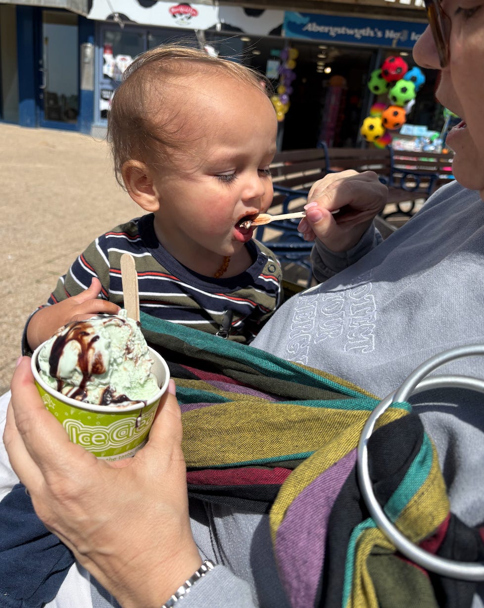While the kids were off getting a pint, Amanda and I took Quinn and strolled along Aber’s promenade. You could hear the gulls overhead, sharp and insistent. The wind carried the scent of salt and fish. Signs for rentable beach huts popped up between weathered hotels that hadn’t kept up with the century; once opulent, now monuments to a different time.