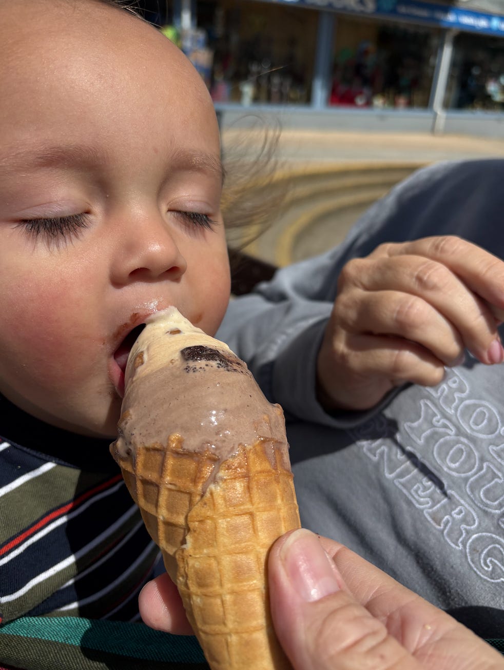 So we found the nearest shop. I got a cone, Amanda got a cup. We parked ourselves on a bench near the water, sharing bites with Quinn, watching the waves, shooing away the seagulls, and feeling the wind.