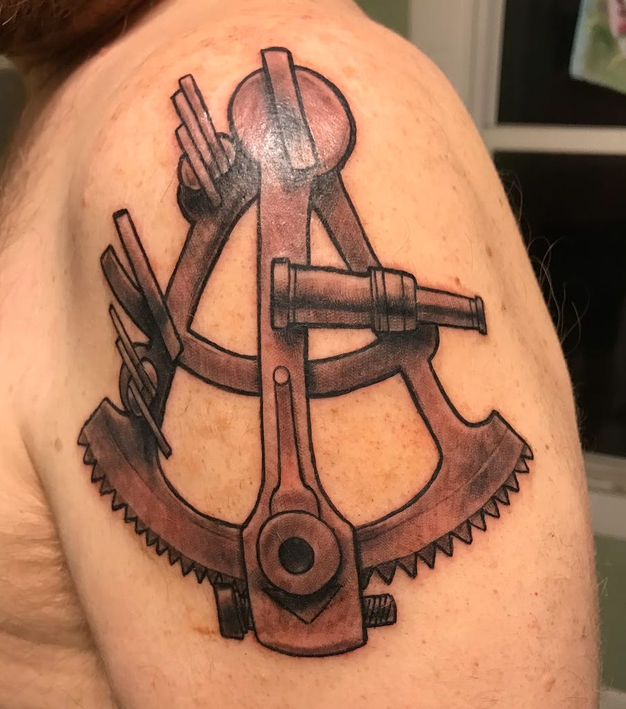 Twenty-five years ago, we met for the first time at Lake Wales High School. Amanda swears we were connected long before that first day. I believe her. I moved to Lake Wales instead of taking a job in Jacksonville. She chose LWHS over Lakeland High. We spent two years in the same town without ever meeting, making a dozen little choices that could have sent us the other way. If she had zigged while I zagged, when would the universe have linked us? She always knew we were connected–I just took the longer road to get to her. That’s why I have a sextant tattooed on my arm; she’s my north star. The connection was already there; it was just waiting for us to finally notice.